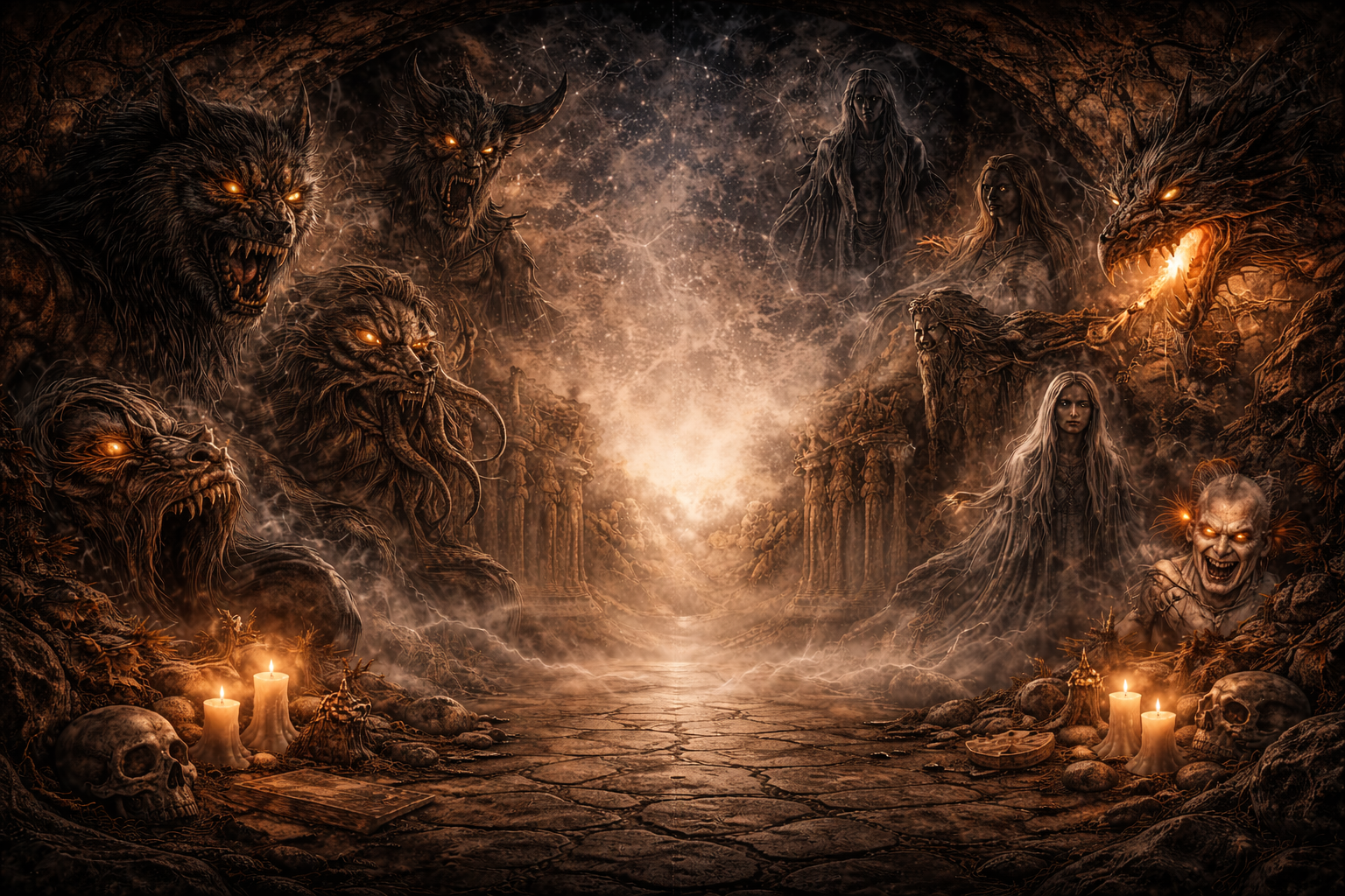 Dragon: Global serpentine creature associated with power, chaos, or wisdom depending on culture.