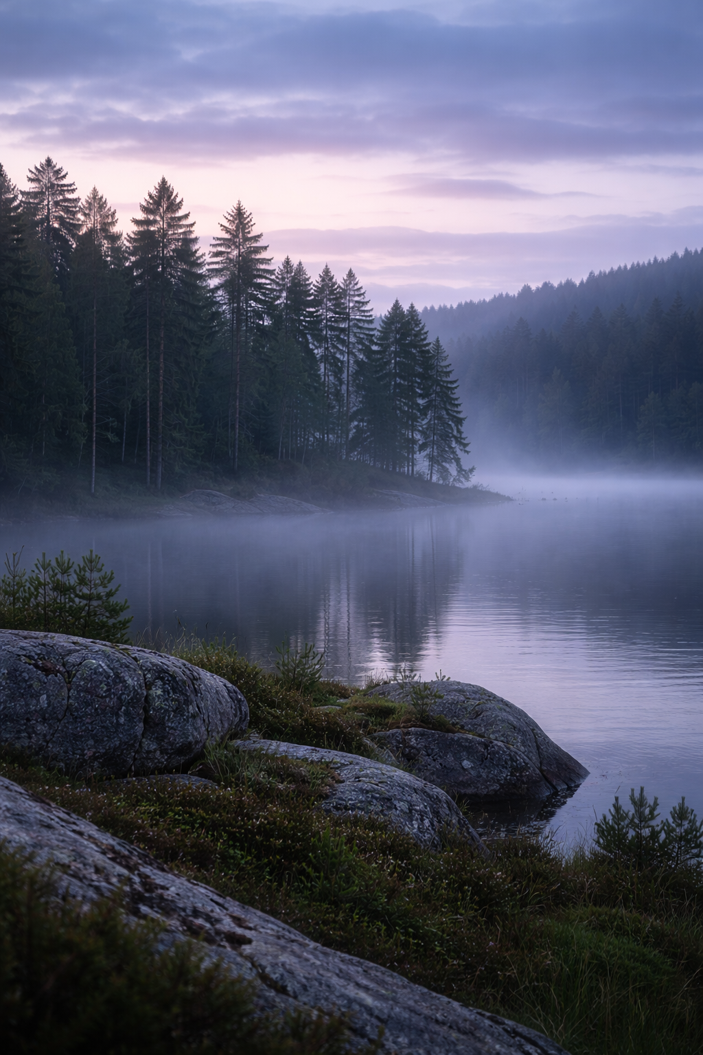Misty dawn over a tranquil lake
